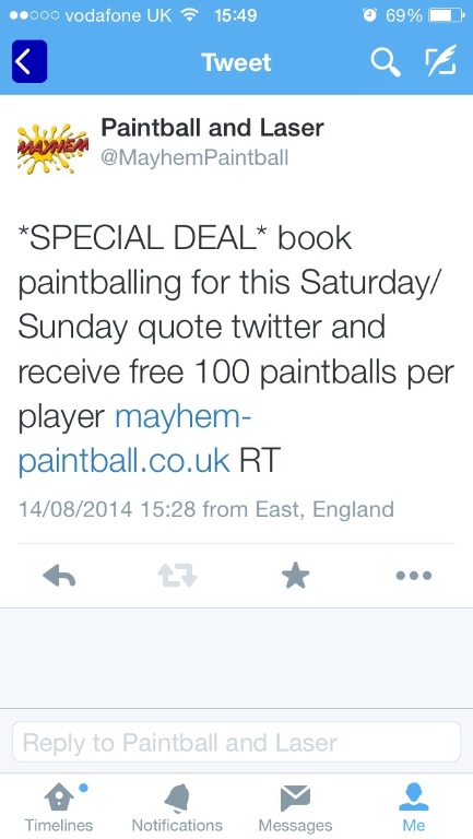 Give us a call in the office to book and quote  twitter  deal you will receive  an extra 100 paintballs per player !